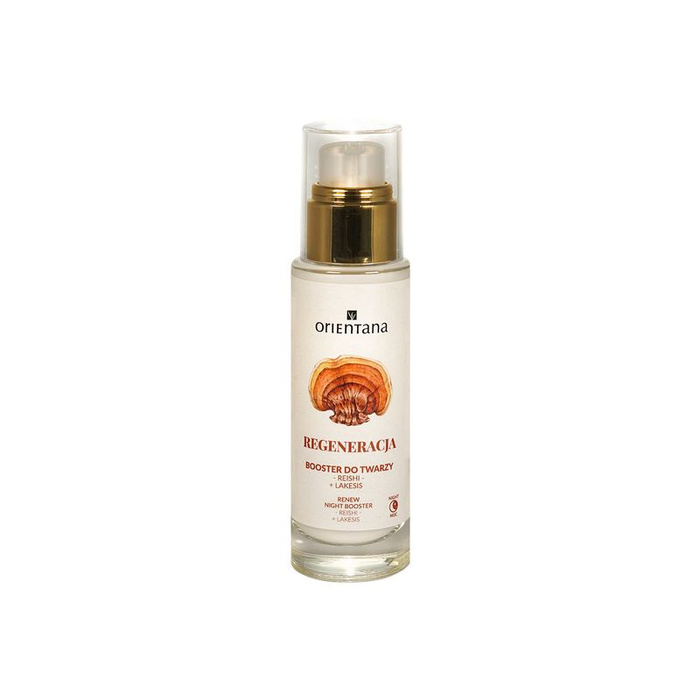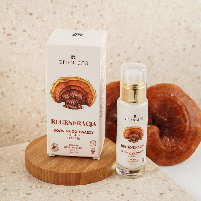 Słabe nawilżenie skóry czy utrata jej gęstości to problemy, którym możesz zaradzić! Sięgnij po Orientana booster, który regenerując skórę, skutecznie odżywia, poprawia jej jędrność i zmniejsza widoczność zmarszczek. Booster regenerujący na noc został przygotowany z 98,5% naturalnych składników. Wykorzystuje moc naturalnej medycyny azjatyckiej – grzyb reishi o antyoksydacyjnym i odmładzającym działaniu, który dodatkowo skutecznie nawilża i rozjaśnia przebarwienia. Sekret młodej skóry tkwi w fioletowym ryżu, poprawiającym elastyczność i jędrność skóry twarzy. Zawarte w nim aminokwasy, witaminy i cukry odżywiają skórę i dostarczają jej blasku. Efekty zauważysz od razu po zastosowaniu: mniejsza widoczność zmarszczek, promienna, wypoczęta i wyjątkowo gładki w dotyku naskórek. Jeśli Twoja skóra potrzebuje mocnej regeneracji – mamy coś dla Ciebie! Wybierz booster do twarzy Orientana i ciesz się piękną, i młodą skórą po każdej nocy!