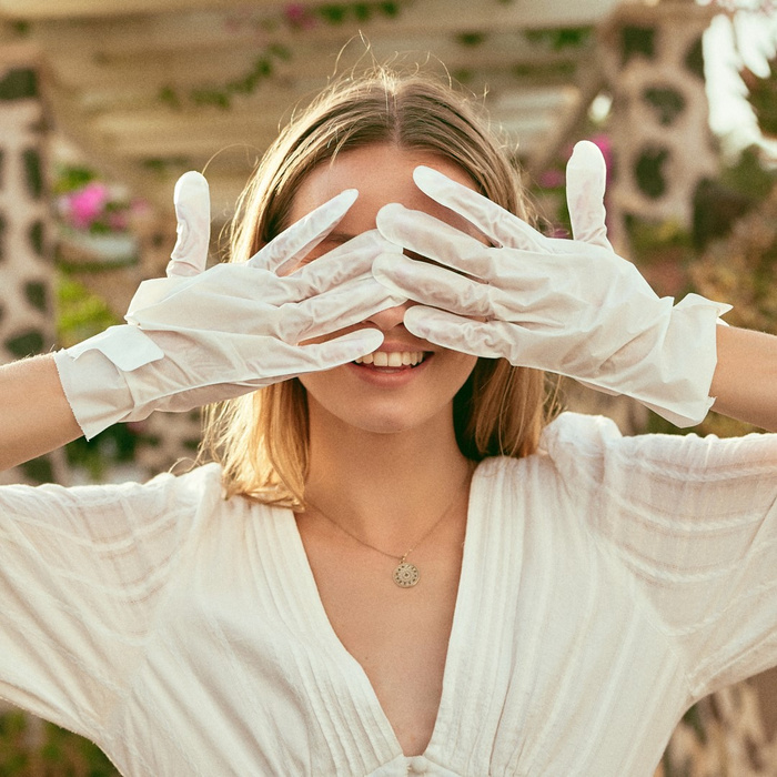 Regenerująca i pielęgnująca maska zamknięta w rękawicach o subtelnym zapachu białej herbaty, przeznaczona do intensywnej pielęgnacji dłoni.