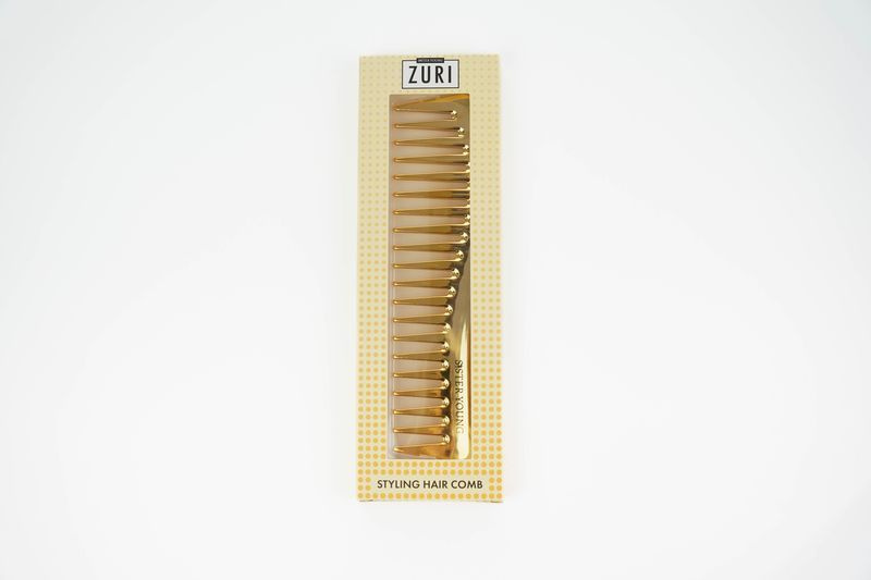 Elegancki design i srebrny kolor: Grzebień ZURI Gold wyróżnia się estetycznym wykończeniem oraz eleganckim designem. Stanowi nie tylko funkcjonalne narzędzie do pielęgnacji włosów, ale również stylowy dodatek do Twojej kolekcji akcesoriów do włosów. Dzięki swojej wyjątkowej estetyce i solidnej konstrukcji, grzebień ZURI Gold nie tylko zapewnia efektywną pielęgnację, ale także dodaje elegancji każdej codziennej lub specjalnej stylizacji włosów.