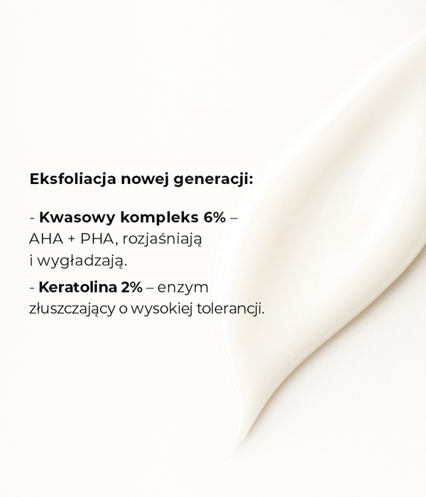 - Kompleks kwasów 6% (glukonolakton, kwas maltobionowy, fitowy, szikimowy i traneksamowy) - Zaawansowane połączenie kwasów, w tym kwas nowej generacji, które skutecznie poprawiają teksturę skóry, wygładzają ją i rozjaśniają. Działają synergicznie, w łagodny sposób usuwają martwy naskórek, pozostawiając skórę świeżą i promienną.
