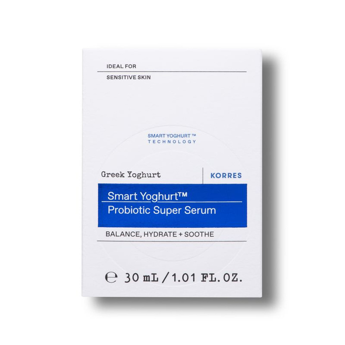 Produkt Greek Yoghurt Comforting Probiotic Serum został zamknięty w minimalistycznym opakowaniu z pipetą o pojemności 30 ml SMART YOGHURT™ PROBIOTYCZNE SUPER SERUM Wzbogacone technologią SMART YOGHURT™, wielofunkcyjne serum dopasowuje się do zróżnicowanych potrzeb skóry, przywracając równowagę mikrobiomu, wzmacniając barierę skóry. Jedyne chłodzące serum z formułą z prawdziwym jogurtem greckim i ekstraktem z owsa, zapewnia natychmiastowy zastrzyk nawilżenia, jednocześnie kojąc i łagodząc wrażliwą skórę.