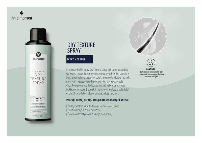 Potrzebujesz szybkiego efektu uniesienia i objętości, bez sklejania i obciążania włosów? Dry Texture Spray od HH Simonsen® to transparentny, ultralekki spray, który natychmiast dodaje włosom struktury i gęstości, pozostawiając je puszyste, pełne objętości i naturalnego ruchu – przez cały dzień.