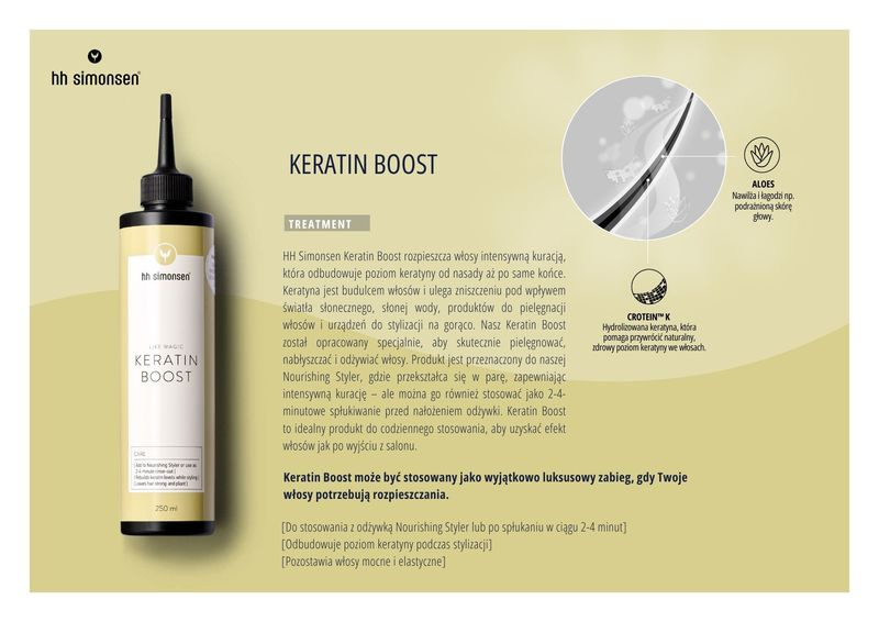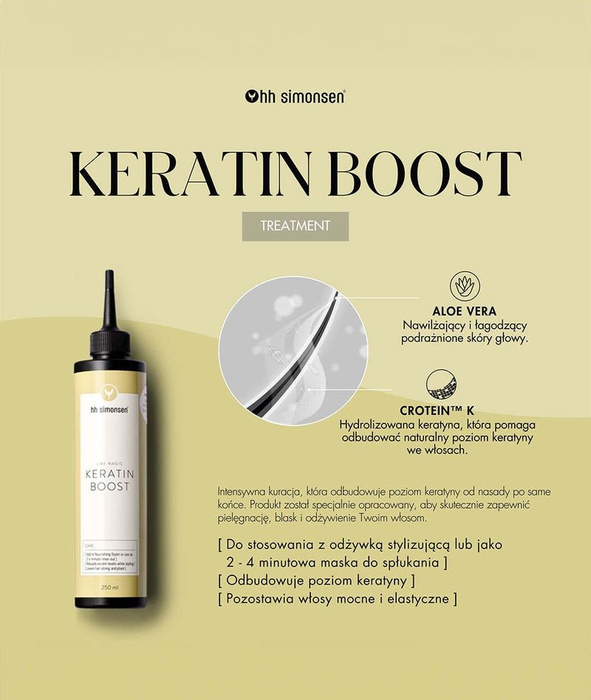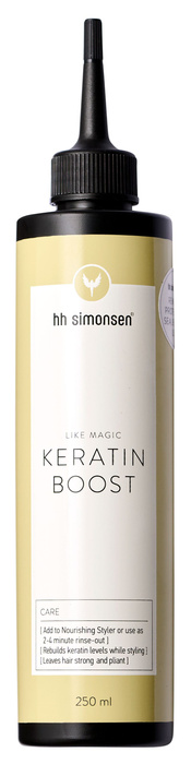 Zadbaj o swoje włosy jak profesjonalistka. Sięgnij po HH Simonsen® Keratin Boost, jeśli zależy Ci na trwałej poprawie kondycji włosów i efekcie jak po wizycie w salonie – bez wychodzenia z domu.
