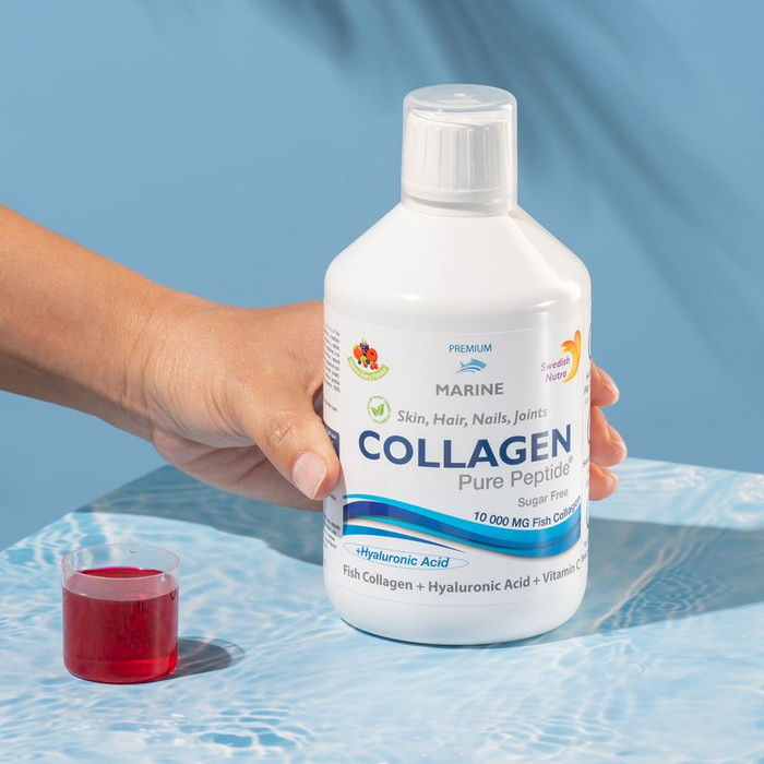Collagen 10 000 mg Marine to płynny suplement diety zawierający 10 000 mg hydrolizowanego kolagenu morskiego typu I i III w jednej porcji. Produkt został wzbogacony o kwas hialuronowy, witaminy C, B5, B6, B7, B12 i D, minerały takie jak selen i krzemionka oraz ekstrakty z aloesu, zielonej herbaty i pestek winogron. Preparat ma naturalny smak marakui i nie zawiera cukru – słodzony jest naturalnymi substancjami o niskim indeksie glikemicznym (ksylitol, erytrytol, stewia).