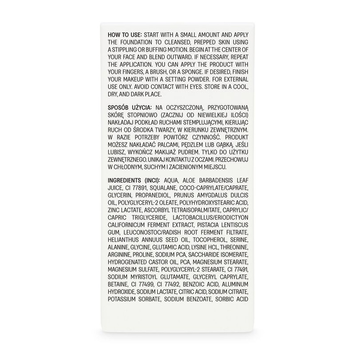 Aqua, Aloe Barbadensis Leaf Juice, CI 77891,Squalane, Coco-Caprylate/Caprate, Glycerin, Propanediol,Prunus Amygdalus Dulcis Oil, Polyglyceryl-2 Oleate,Polyhydroxystearic Acid, Zinc Lactate, Ascorbyl Tetraisopalmitate,Caprylic/Capric Triglyceride, Lactobacillus/EriodictyonCalifornicum Ferment Extract, Pistacia Lentiscus Gum,Leuconostoc/Radish Root Ferment Filtrate, Helianthus AnnuusSeed Oil, Tocopherol, Serine, Alanine, Glycine, Glutamic Acid, LysineHcl, Threonine, Arginine, Proline, Sodium PCA, Saccharide Isomerate,Hydrogenated Castor Oil, PCA, Magnesium Stearate, MagnesiumSulfate, Polyglyceryl-2 Stearate, CI 77491, Sodium MyristoylGlutamate, Glyceryl Caprylate, Betaine, CI 77499, CI 77492,Benzoic Acid, Aluminum Hydroxide, Sodium Lactate, Citric Acid,Sodium Citrate, Potassium Sorbate, Sodium Benzoate, Sorbic Acid