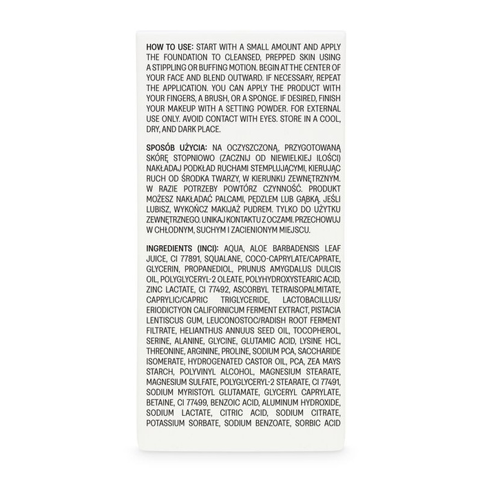 Aqua, Aloe Barbadensis Leaf Juice, CI 77891,Squalane, Coco-Caprylate/Caprate, Glycerin, Propanediol,Prunus Amygdalus Dulcis Oil, Polyglyceryl-2 Oleate,Polyhydroxystearic Acid, Zinc Lactate, Ascorbyl Tetraisopalmitate,Caprylic/Capric Triglyceride, Lactobacillus/EriodictyonCalifornicum Ferment Extract, Pistacia Lentiscus Gum,Leuconostoc/Radish Root Ferment Filtrate, Helianthus AnnuusSeed Oil, Tocopherol, Serine, Alanine, Glycine, Glutamic Acid, LysineHcl, Threonine, Arginine, Proline, Sodium PCA, Saccharide Isomerate,Hydrogenated Castor Oil, PCA, Magnesium Stearate, MagnesiumSulfate, Polyglyceryl-2 Stearate, CI 77491, Sodium MyristoylGlutamate, Glyceryl Caprylate, Betaine, CI 77499, CI 77492,Benzoic Acid, Aluminum Hydroxide, Sodium Lactate, Citric Acid,Sodium Citrate, Potassium Sorbate, Sodium Benzoate, Sorbic Acid