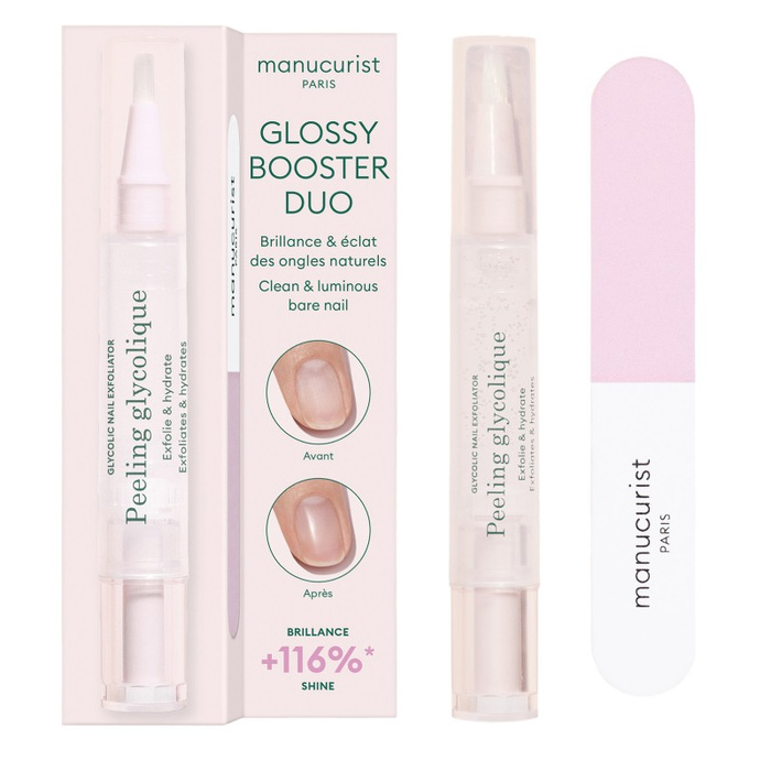 Manucurist Glossy Booster Duo to innowacyjny zestaw, który w ekspresowym tempie przywraca blask i promienny wygląd naturalnym paznokciom.
