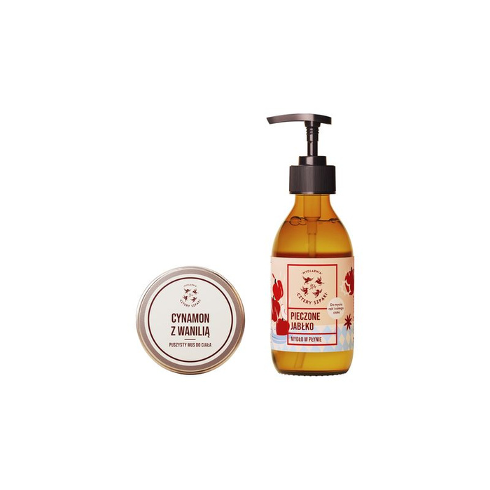 Jabłko z Cynamonem to zestaw świąteczny, w skład którego wchodzi rzemieślnicze mydło w płynie Pieczone Jabłko oraz puszysty mus do ciała Cynamon z Wanilią. Opcja idealna, kiedy za oknem hula słota lub śnieżyca, a ochota na coś słodkiego pojawia się średnio kilka razy dziennie. Zestaw zapakowaliśmy w piękne pudełko, które czyni z niego idealną opcję prezentową.
