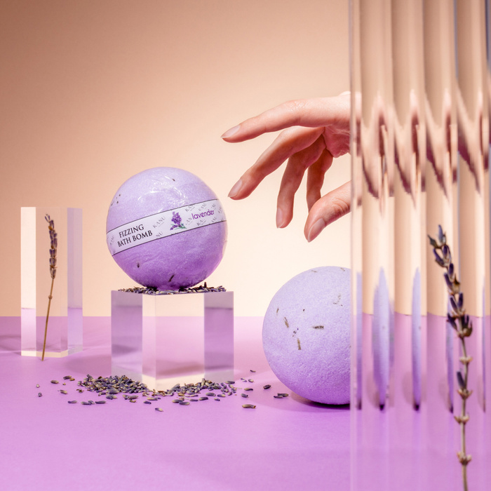 - Ręcznie formowana, musująca kula do kąpieli o zapachu lawendowym